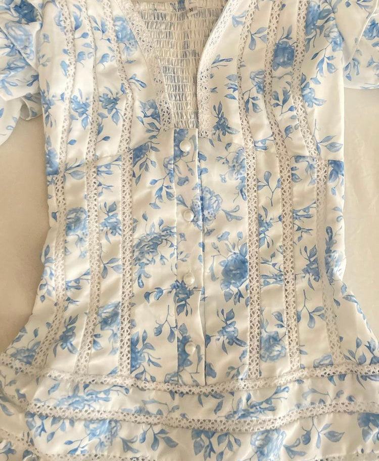 can’t help getting in touch with your feminine side in this pretty, ruffly piece! fitted through the waist, it has a v neck and layered, ruffles on the sleeves and skirt. stretchy smocked back for shape and fit. all in white fabric with a blue floral pattern that had us in AWE.