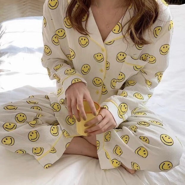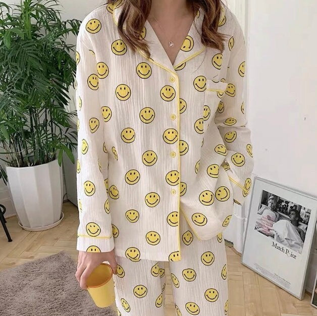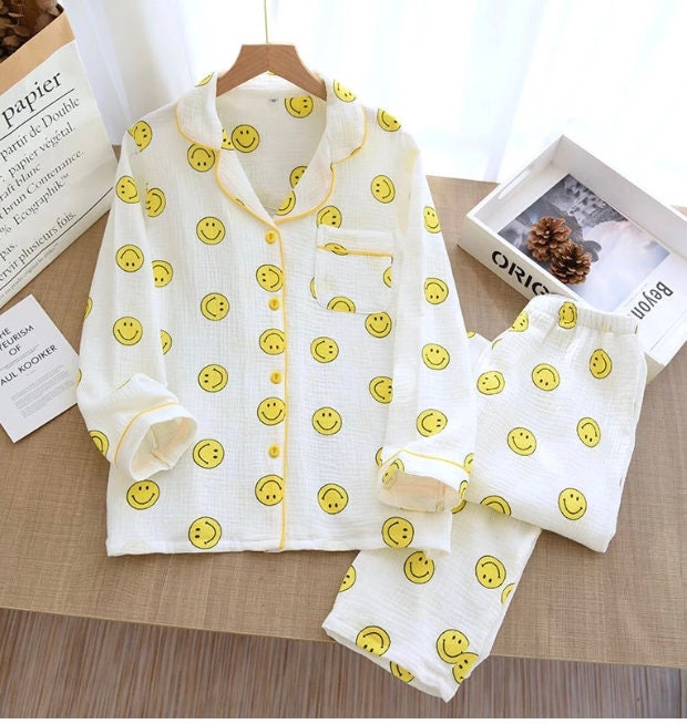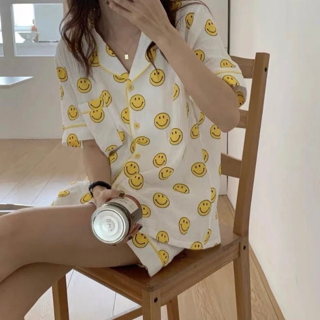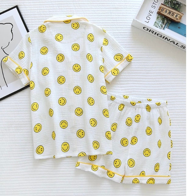 Our set is a soft yellow button up smiley face top and short gauze pajama set. Perfect for lounging and lazy days. fit: these