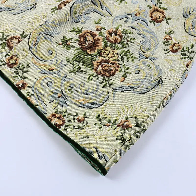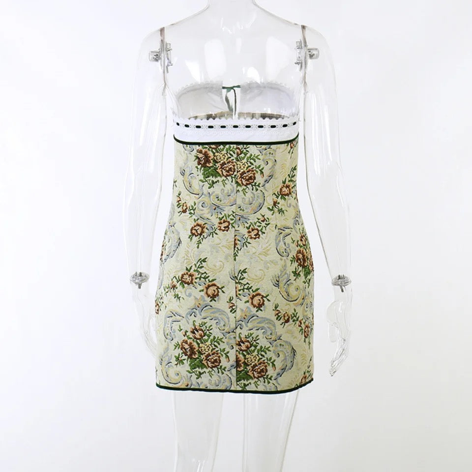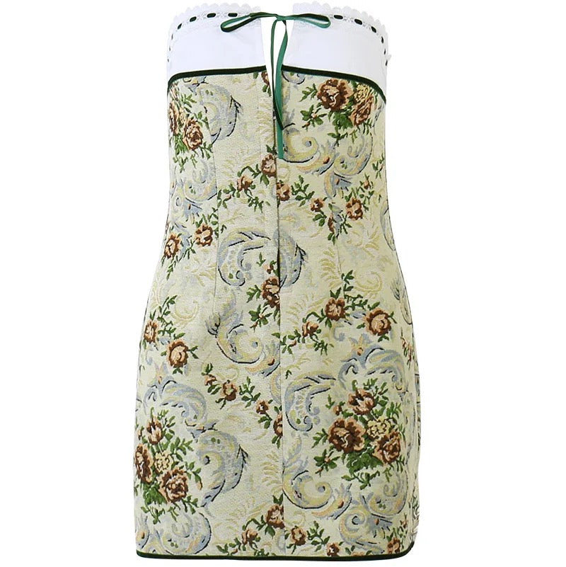 For a touch of luxury, the dress features a lush green velvet accent, which adds a lavish and opulent feel to the overall design. The combination of the floral pattern, strapless style, lace embellishments, and the vintage charm creates a truly enchanting ensemble that will make you feel like a true fashion icon.