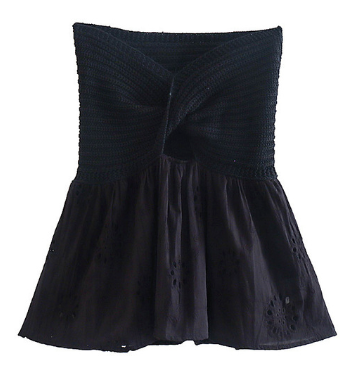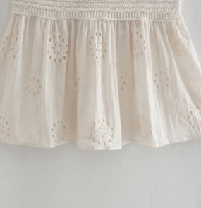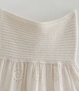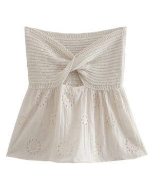 The Twix Top is available in two colors (beige and white) & three different sizes(S, M, and L). This top is strapless and embroidered at the top, giving a sweater, cozy like feel while being airy and breathable with flower patterns at the bottom. This is the perfect top for this summer and super easy to match.
