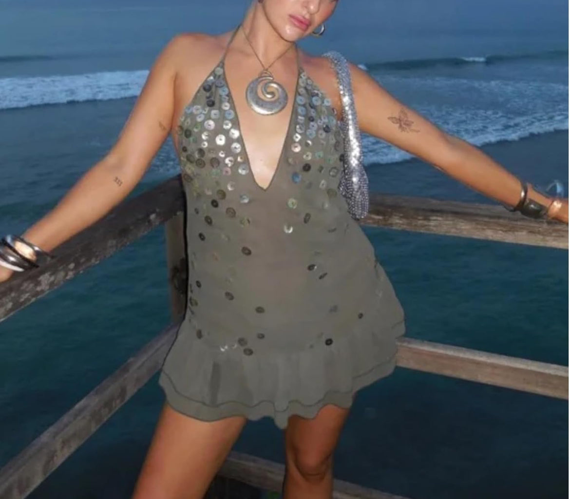 A flirty and elegant sleeveless mini dress with shimmering silver sequins, designed to turn heads from beachside cocktails to late-night dance floors. With its deep V-neckline, subtle ruffle hem, and barely-there backless fit, The St Tropez Dress is a standout staple in your summer wardrobe.