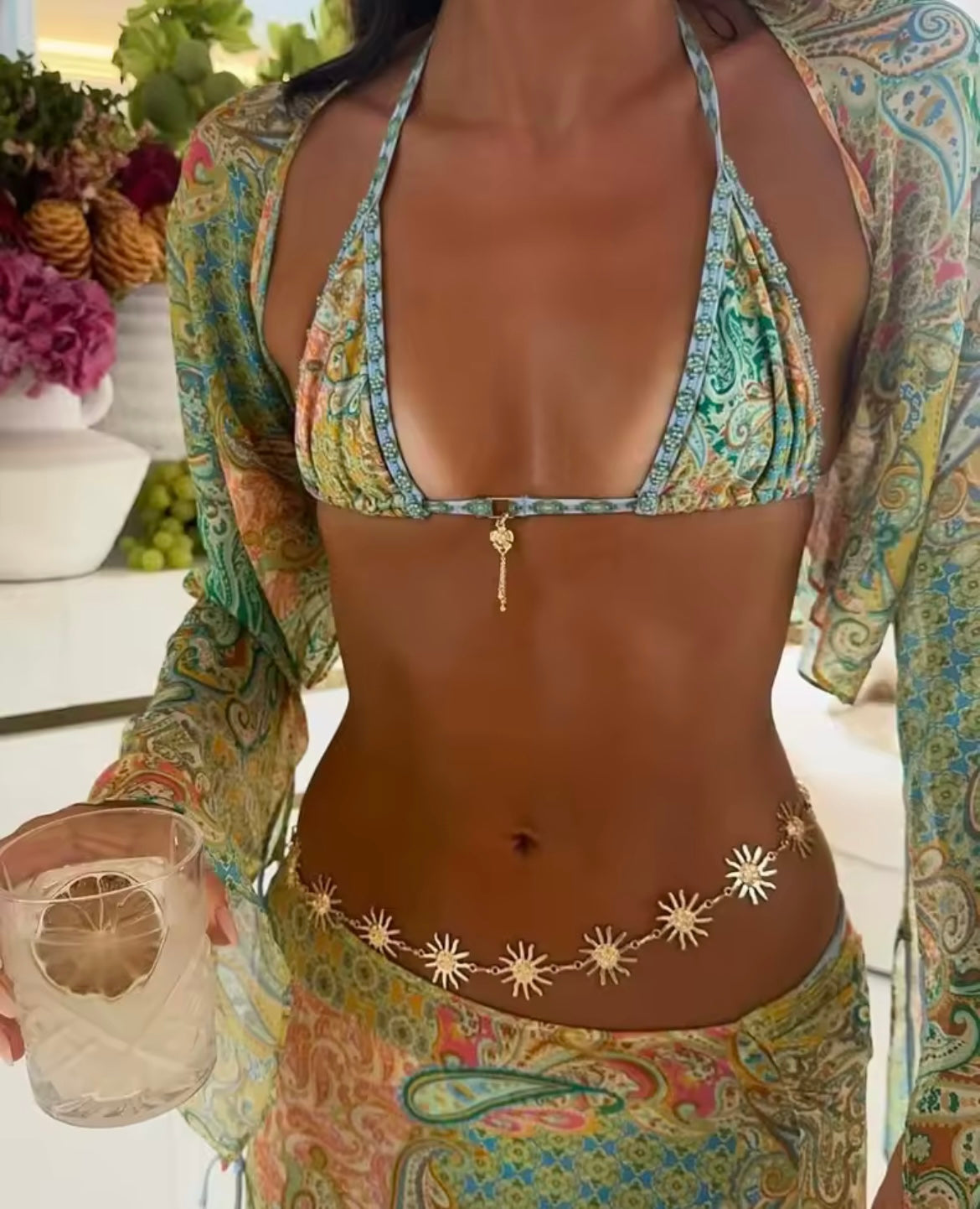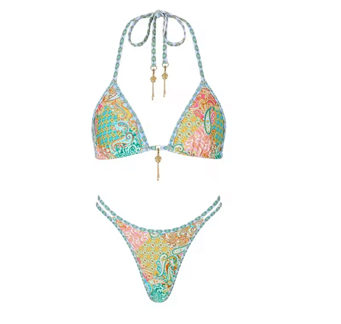 Turn heads this summer with the St. Barths Bikini — a vibrant, paisley-printed two-piece designed for sun-drenched getaways and poolside lounging.